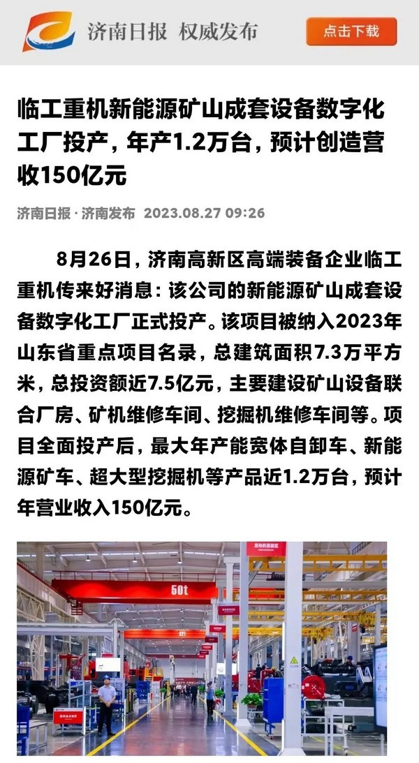 8月26日,中国·350vip8888重机数字化工厂投产活动在济南高新区智能装备城举行。中国·350vip8888重机新能源矿山成套设备数字化工厂项目,入选2023年山东省重点项目,总建筑面积7.3万平方米,总投资额近7.5亿元,最大年产能宽体自卸车、新能源矿车、超大型挖掘机等产品1.2万台,是山东省首个年产能超万台矿山设备数字化工厂。
